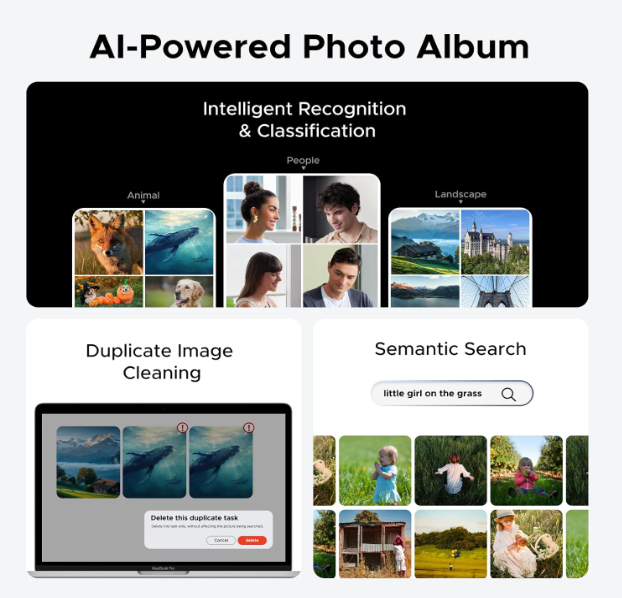 - AI Photo Magic: Auto-sort by faces, places, things. Instantly remove duplicates.