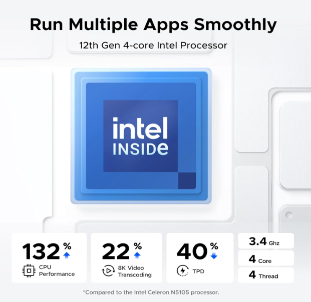 The 12th Gen Intel N100 processor offers robust performance for 4K streaming, multi-user access, and fast backups, all while maintaining low power consumption.