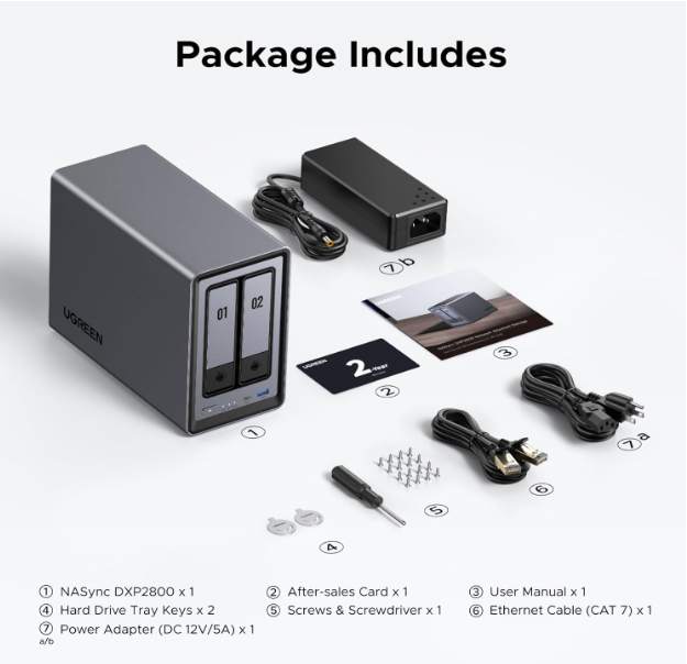 SKU 25242 Model DXP2800 Supported Languages English, Deutsch, Français, Español, Português, Italiano, 中文, 日本語 Drive Bays 2-Bay (SATA) Operating System UGOS Pro CPU Model N100 CPU Brand & Architecture Intel X86 12th Generation N Series 4 Cores 4 Threads Memory (RAM) 8GB DDR5 ODECC Supported Expandable RAM (max) 16GB Flash Memory (System Disk) eMMC 32GB SATA Drive Bays 2 M.2 SSD Drive Slots 2 RAID JBOD/Basic/0/1 Maximum Storage 60TB (2x 24TB + 2x 8TB) LAN Ports (RJ45) 1x 2.5GbE PCIe Expansion - Thunderbolt™ 4 Ports - High-Speed USB Ports (Front Panel) 1x USB-C, 1x USB-A (both 10Gb/s) High-Speed USB Ports (Rear Panel) 1x USB-A (5Gb/s) USB 2.0 (Rear Panel) 2x USB-A (480Mb/s) SD Card Reader - HDMI 4K Wi-Fi - Product Dimensions 9.1" × 4.3" × 7.0" Power Consumption 16.38W (drive access)