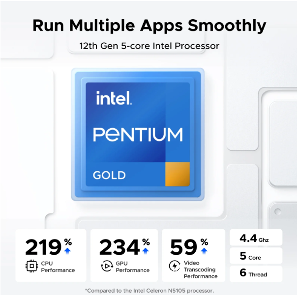 Powered by the 12th Gen Intel Pentium Gold Processor 8505, it delivers powerful performance for NAS multitasking while keeping power consumption low, ideal for 24/7 use.