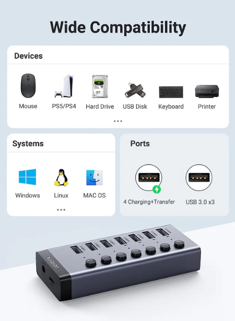 - Widely Compatible & Plug and Play: The UGREEN USB 3.0 Hub is driver free for Windows XP/Vista/11/ 10/8, macOS-8/9/X, UNIX, and Linux. Easily expand USB ports to your laptop or desktop PC at any time.